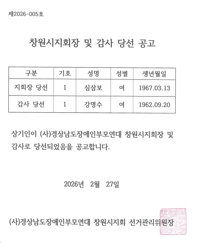 창원시지회장 및 감사 당선 공고